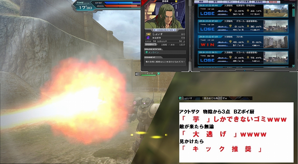 典型的ガイジ 口だけ達者。腕は三流以下 基本三点バズ垂れ流し、白チャットでイキるが常に最下位。 戦場において利敵行為(意味不明なビーコンを設置、核を適当に起動させる) 居るだけ無駄な存在。