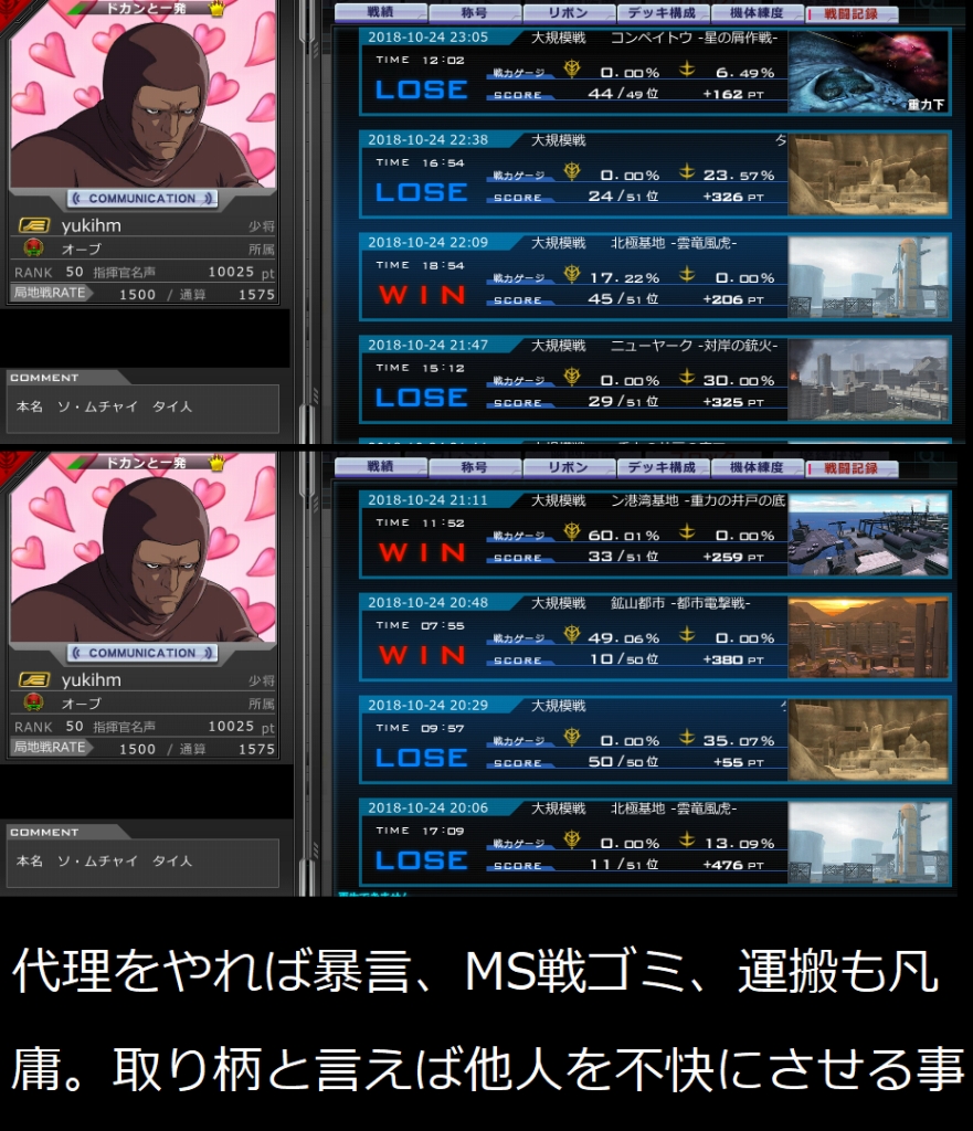 典型的ガイジ。腕もなく寄生虫でしかない。 指揮すれば暴言、MS戦はセンスなくK<D、核運搬も下手。 何をやってもまるだダメな典型。