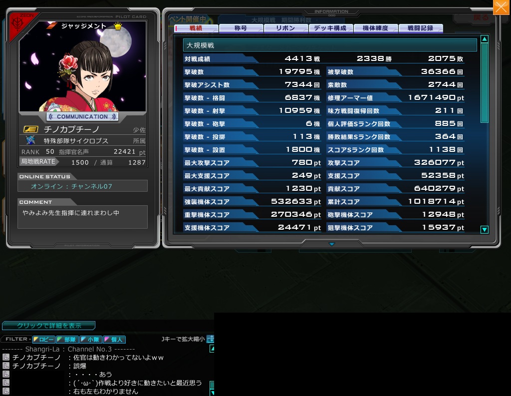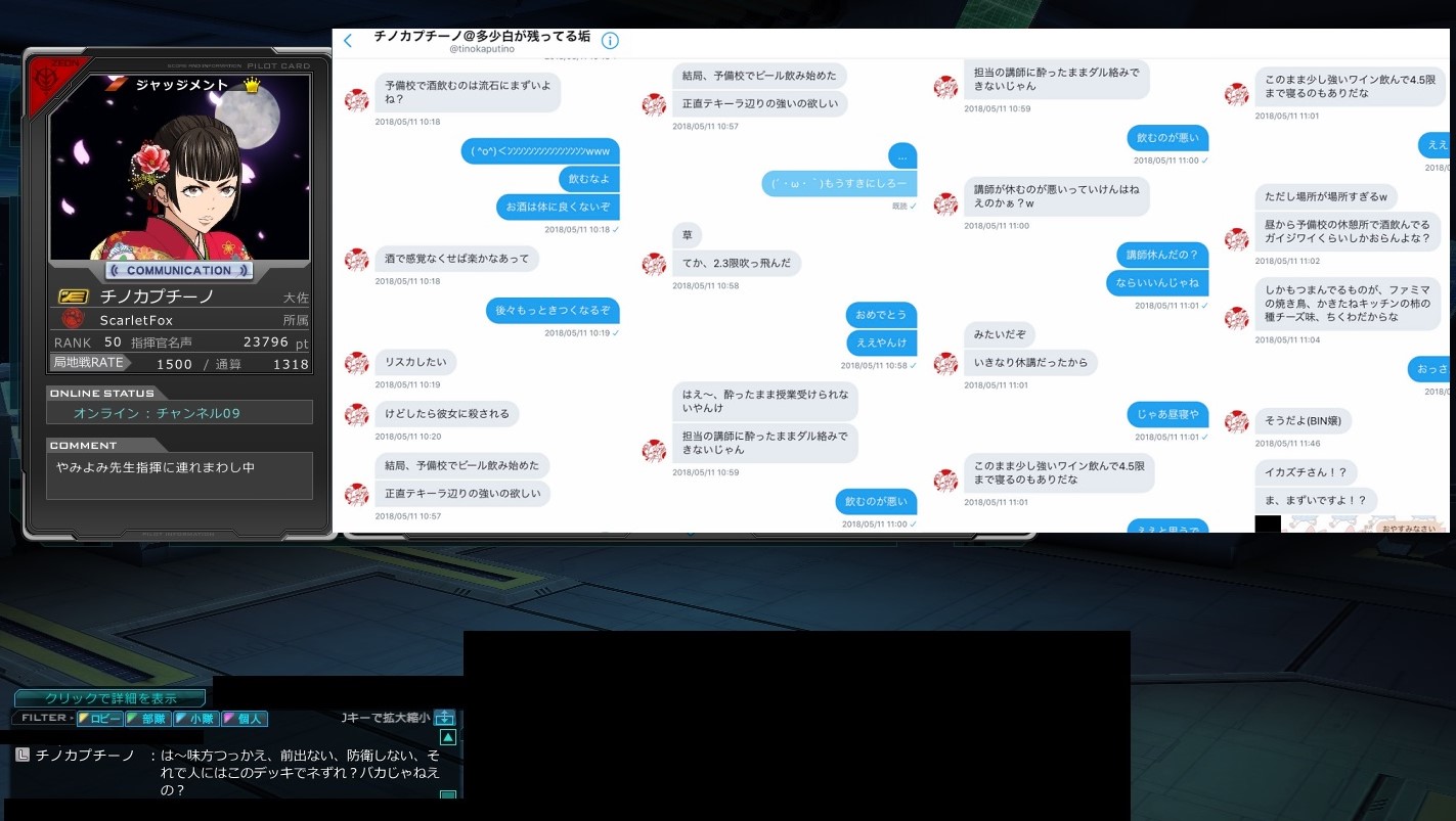 S鯖:ジオン キャラ名:チノカプチーノ 連邦:フルブきついよ 部隊:特殊部隊サイクロプス →大学合格の為、ガンオン引退と一部で話が回る →実際は法政大学受験失敗(平成30年度) →浪人生