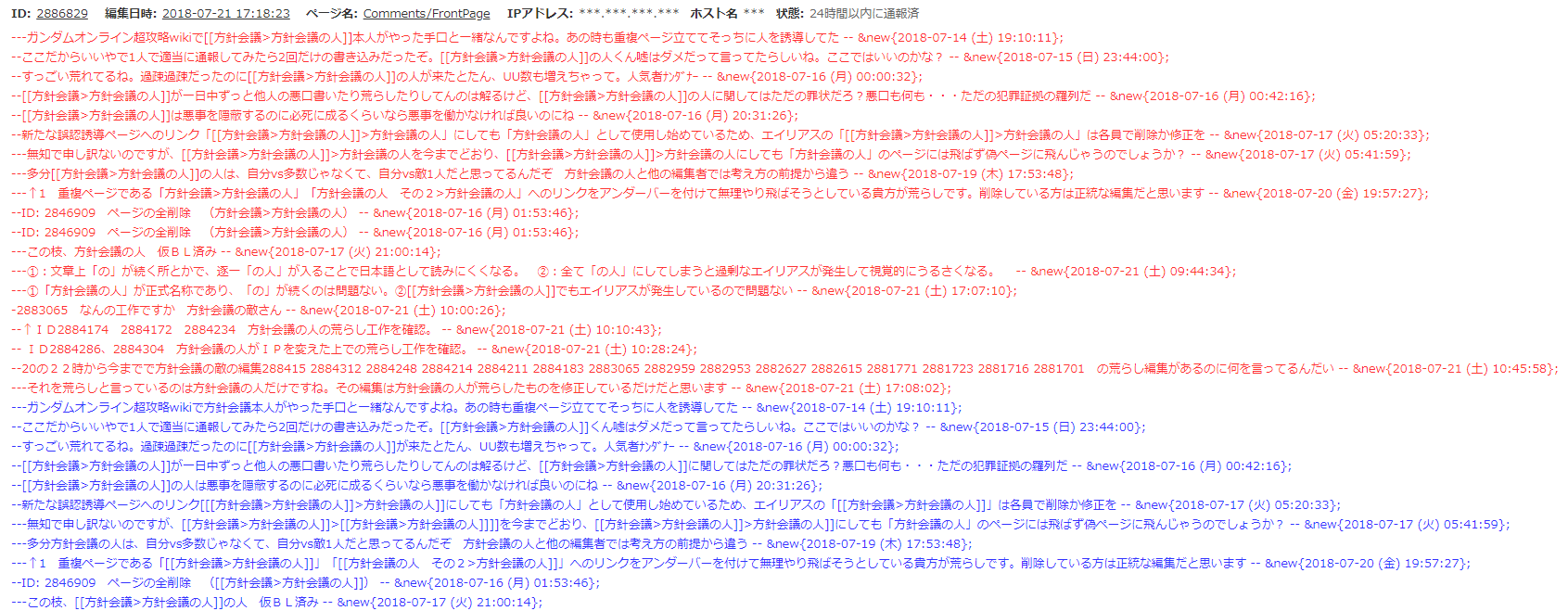 挙げ句、雑談板の多数のログや幾つかのページで、wiki内を削除して回るという発狂状態となる。