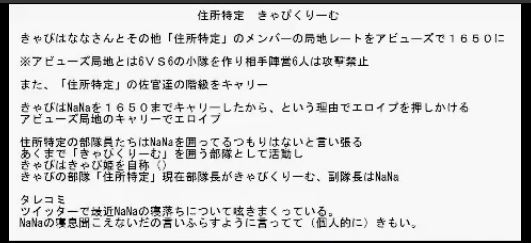 専属や仲間、敵対勢力勢を囲ってアビューズ行為をしスコア稼ぎ、ランキング報酬稼ぎに没頭する害ジ